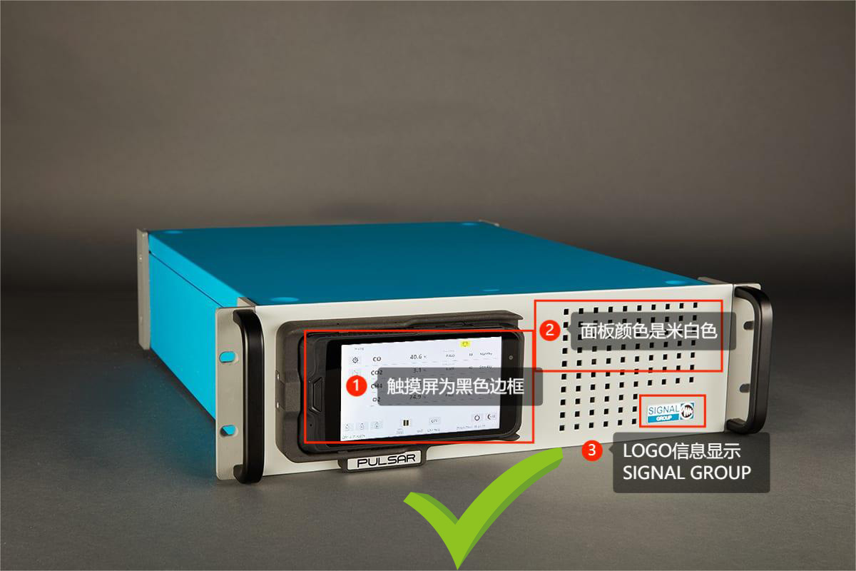 正品SIGNAL儀器體積更小、機(jī)體外觀(guān)顏色是和LOGO相同的藍(lán)綠色,前端面板為米白色,觸摸屏邊框?yàn)楹谏ú凼皆O(shè)計(jì),面板信息顯示均與仿冒品不同。